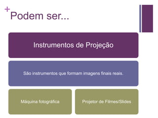 O documento descreve diferentes tipos de instrumentos ópticos, incluindo instrumentos de projeção como máquinas fotográficas e projetores de filmes que formam imagens reais, e instrumentos de observação como microscópios e telescópios que formam imagens virtuais. Detalha também como esses instrumentos funcionam e exemplos específicos como o Telescópio Espacial Hubble.