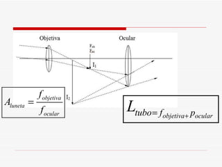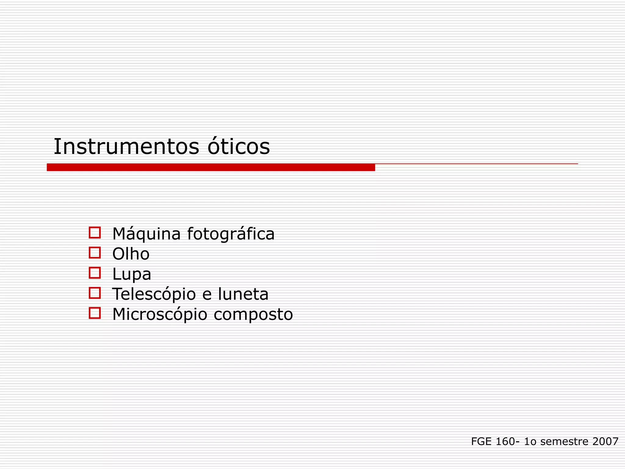 O documento descreve vários instrumentos óticos, incluindo o olho humano, máquina fotográfica, lupa, microscópio composto, luneta terrestre, binóculos, telescópio refletor amador e o Telescópio Espacial Hubble. Fornece detalhes sobre como cada um funciona, como a distância focal, aumento e tipos de imagens formadas.