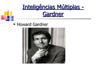 O documento discute a Teoria das Inteligências Múltiplas desenvolvida por Howard Gardner, que identificou vários tipos de inteligência além das lógico-matemática e lingüística. Ele lista 11 tipos de inteligência e explica que cada indivíduo tem um "espectro" próprio de inteligências. A escola deve estimular o desenvolvimento de todas as inteligências para ajudar os alunos a atingirem seus objetivos de forma harmoniosa.