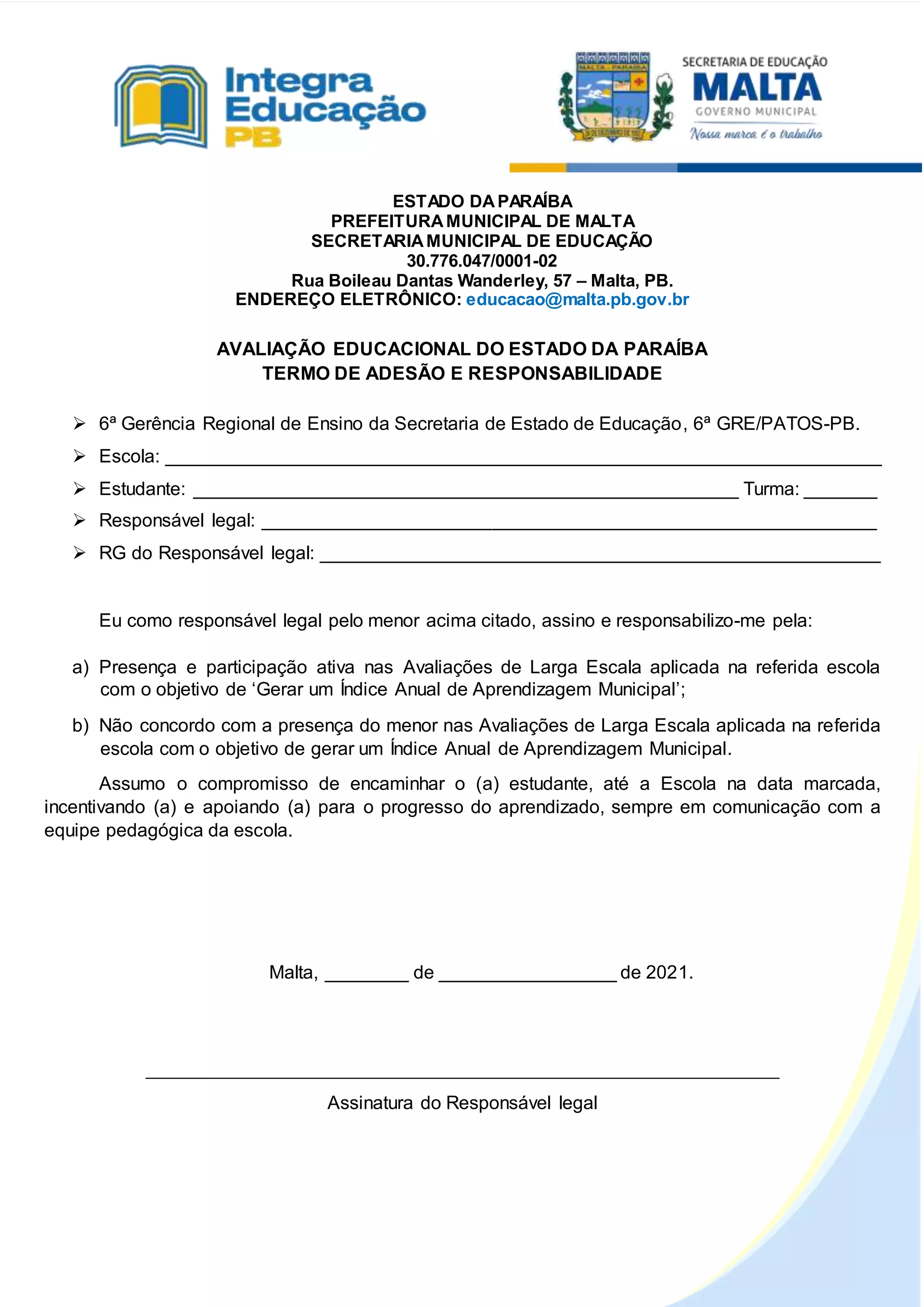 Este documento é um termo de adesão e responsabilidade para avaliações educacionais do estado da Paraíba. Nele, o responsável legal do estudante assina se concorda ou não com a participação do estudante nas avaliações, que têm como objetivo gerar um índice anual de aprendizagem municipal. Ao assinar, o responsável também assume o compromisso de levar o estudante à escola no dia da avaliação para apoiar seu progresso educacional.