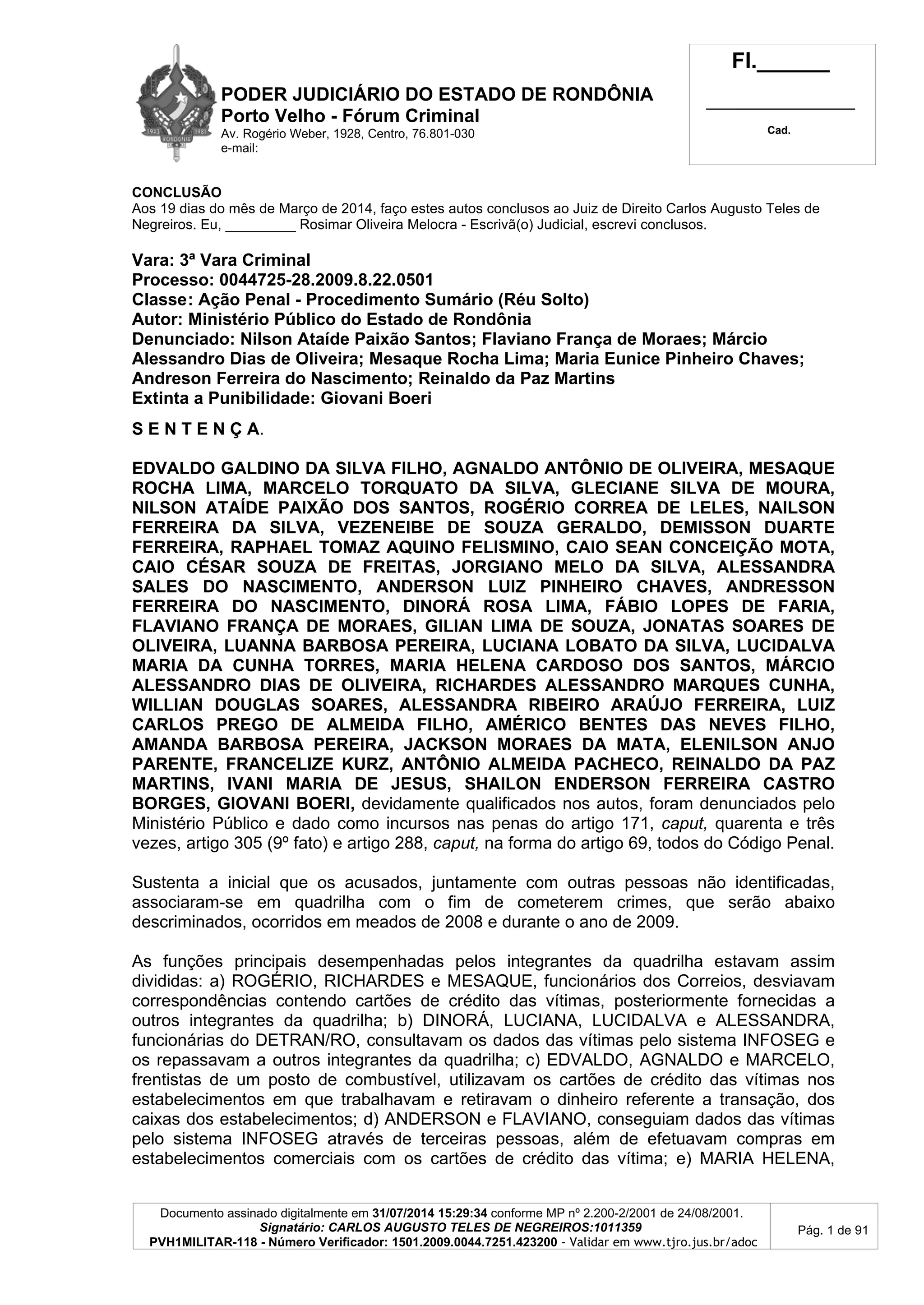 O documento descreve 43 acusações de fraude bancária e associação criminosa contra 40 réus. A denúncia alega que os réus faziam parte de uma quadrilha que desviava cartões de crédito de vítimas, usava dados pessoais obtidos ilegalmente para fazer compras fraudulentas, e dividiam os lucros dos crimes. As acusações incluem fraude em postos de gasolina, lojas de departamento e outros estabelecimentos comerciais.
