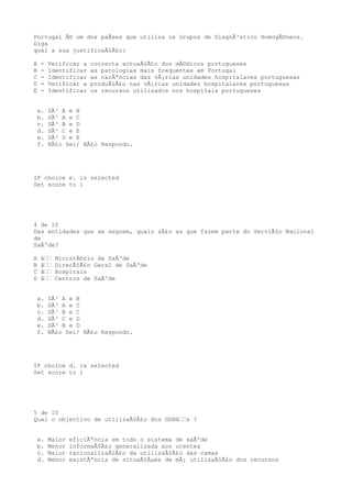 Este documento contém 10 perguntas sobre o sistema de saúde português e os serviços prestados pelos hospitais no país. As perguntas abordam tópicos como o regime de trabalho dos médicos, a avaliação da qualidade dos cuidados de saúde, a utilização dos Grupos de Diagnóstico Homogêneos e a rede de referenciação existente no Sistema Nacional de Saúde português.