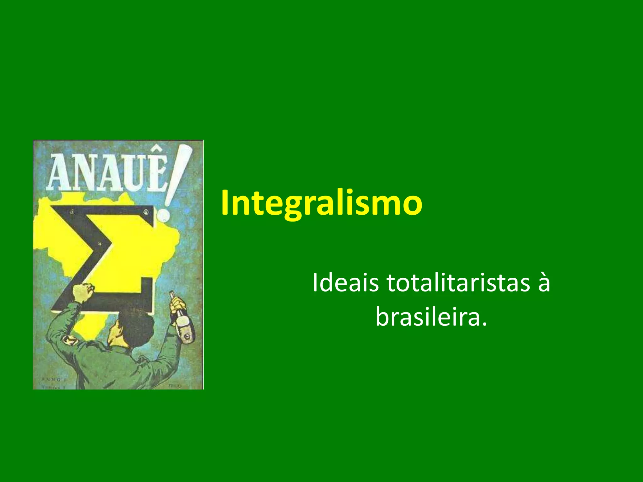 O integralismo foi um movimento político brasileiro inspirado no fascismo italiano, liderado por Plínio Salgado na década de 1930, que defendia ideais totalitários mas nunca chegou ao poder, sendo enfraquecido por rebeliões sem sucesso e pela Revolução de 1930 que levou Getúlio Vargas ao poder.