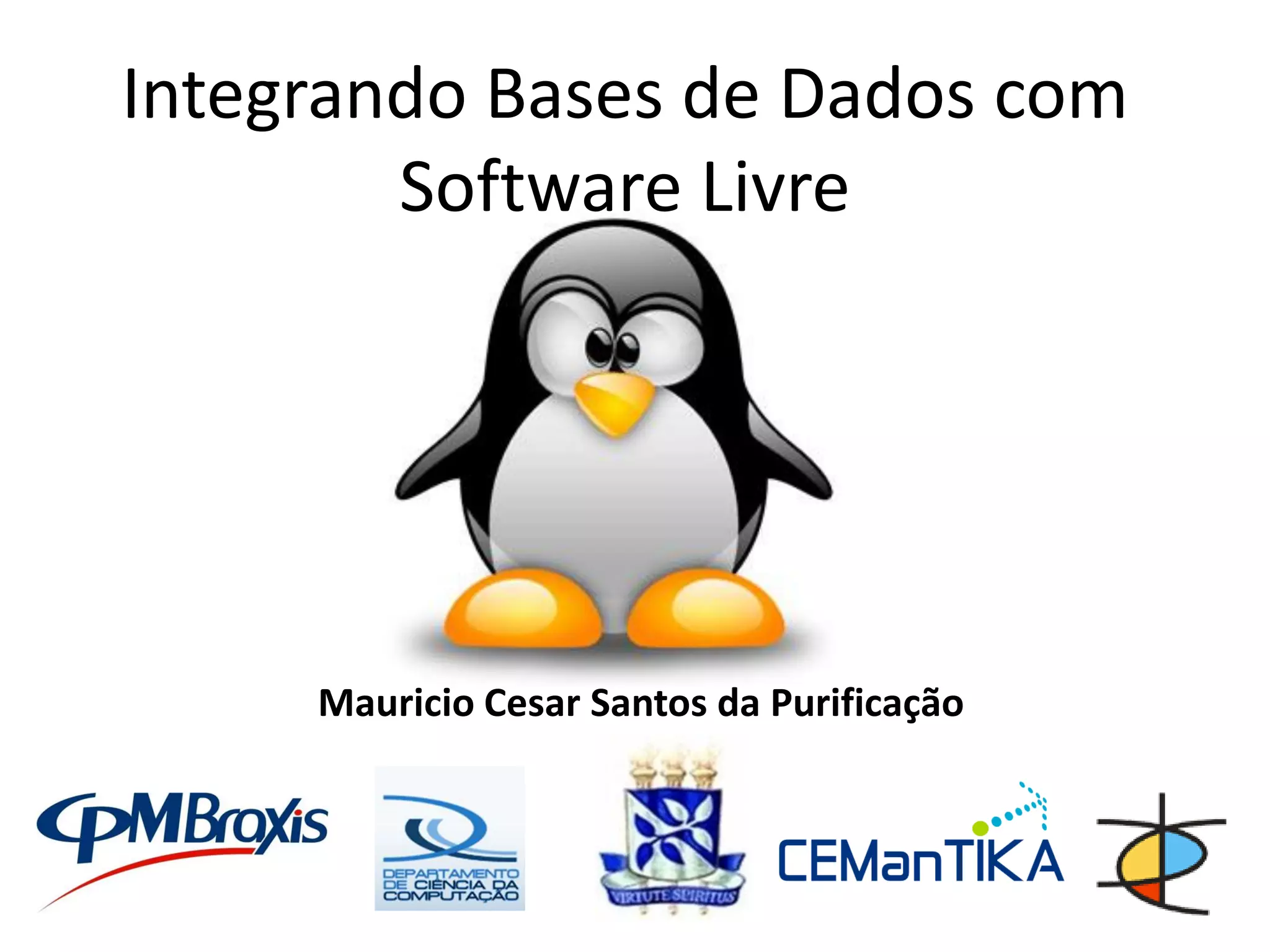 Este documento discute a integração de bases de dados com software livre. Ele explica os desafios da heterogeneidade de sistemas, abordagens para integração de dados como integração estática, dinâmica, bancos de dados federados e mediadores. Também descreve o processo ETL, incluindo extração, transformação, carga e ferramentas open-source populares como Pentaho Data Integration.