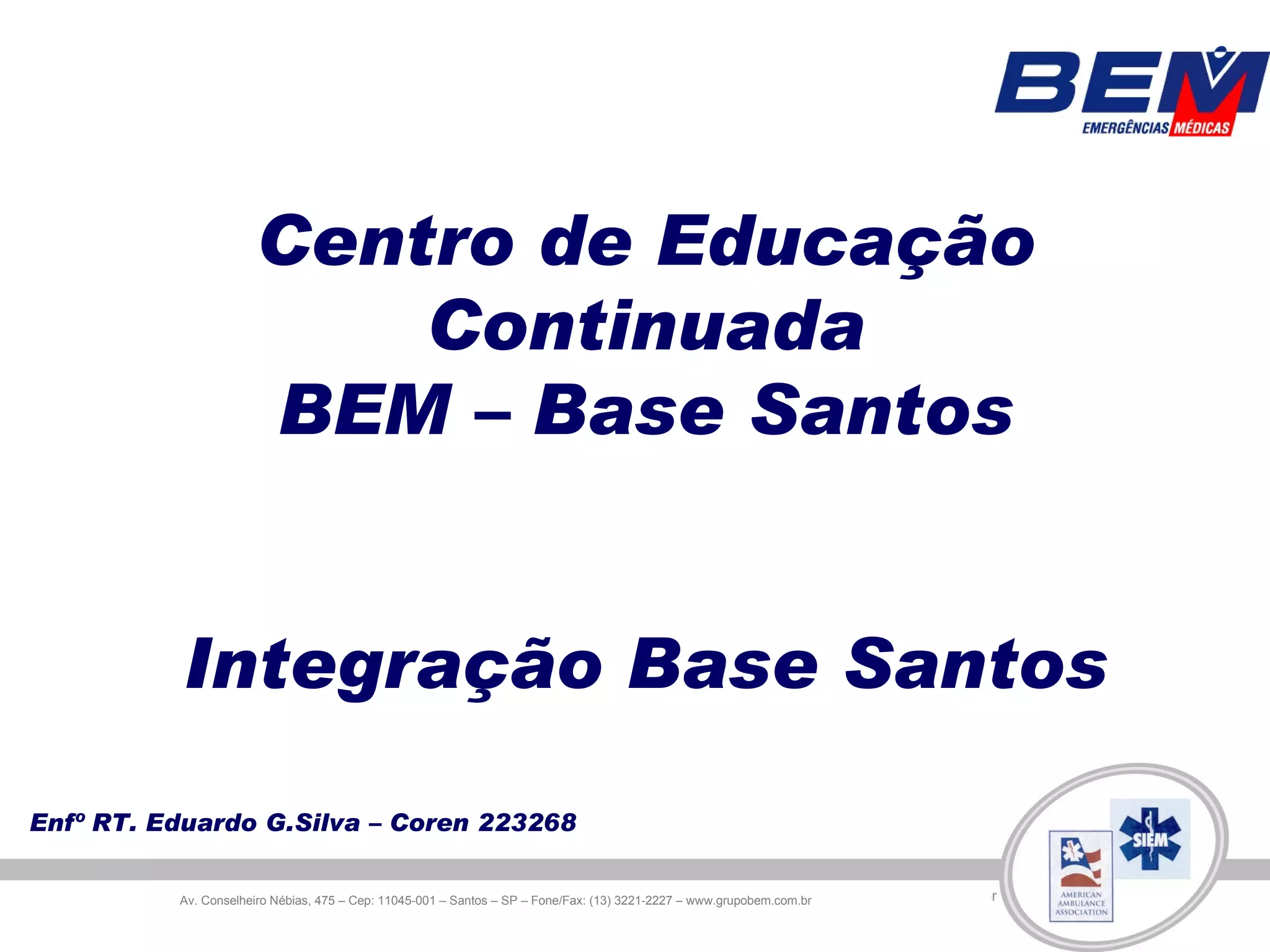 O documento apresenta as informações sobre a integração de profissionais na Base Santos, incluindo o reconhecimento da área física, apresentação das equipes, equipamentos, materiais, protocolos e avaliações necessárias.