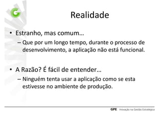 O documento discute integração contínua, incluindo seus conceitos, benefícios e pré-requisitos. A integração contínua envolve construir e testar automaticamente o software sempre que novas mudanças são implementadas para garantir que o software esteja sempre em um estado funcional. Isso ajuda a detectar bugs cedo e manter o software de alta qualidade. Pré-requisitos incluem controle de versão, builds automatizados e testes automatizados.