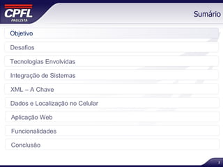 O projeto visa integrar tecnologias para o gerenciamento de equipes via uma aplicação web, minimizando a interação humana na alocação e despacho. Enfrenta desafios como a necessidade de unificar sistemas de comunicação e localização, utilizando tecnologias como GPS e SMS. A solução proposta permitirá monitoramento em tempo real, melhorando a eficiência na identificação e resposta a eventos elétricos.
