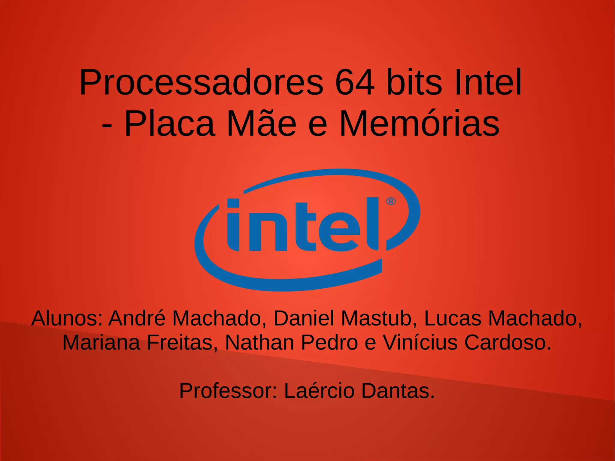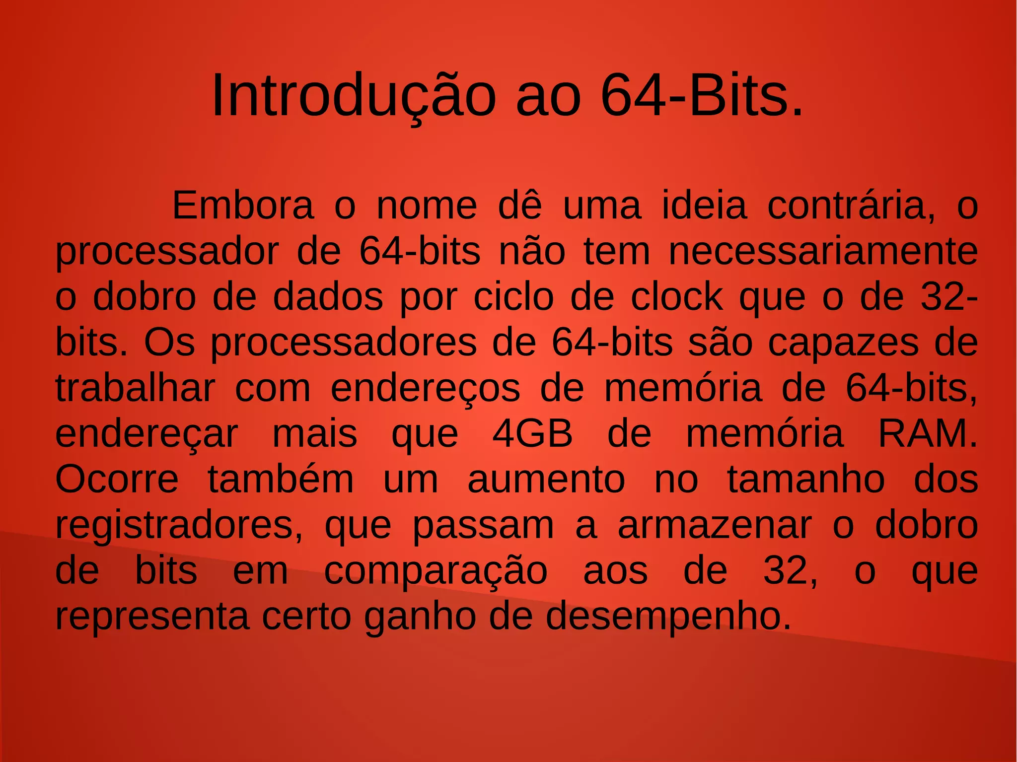 O documento discute processadores Intel de 64 bits, incluindo: (1) A capacidade de endereçar mais de 4GB de memória RAM; (2) O aumento no tamanho dos registradores para armazenar 64 bits; (3) O início do desenvolvimento de 64 bits pela AMD e licenciamento pela Intel.