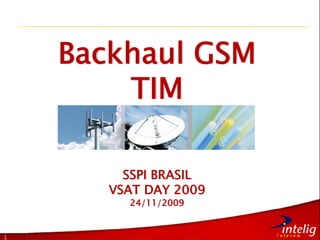 A Intelig Telecom propõe uma solução de backhaul GSM para a TIM utilizando uma única HUB no Rio de Janeiro, integrando a rede VSAT com a rede terrestre DWDM/SDH para fornecer disponibilidade de 99,92% às BTSs. A solução utiliza antenas de 2,4m nas BTSs e a plataforma Shiron Intersky com otimizadores ABIS para fornecer sincronismo e reduzir custos com flexibilidade para novos pontos.