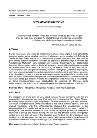 1) O documento discute a Teoria das Inteligências Múltiplas de Howard Gardner, que propõe a existência de várias inteligências humanas ao invés de uma inteligência geral. 2) Gardner identificou sete inteligências principais: linguística, lógico-matemática, espacial, musical, corporal-cinestésica, interpessoal e intrapessosal. 3) A teoria sugere que diferentes pessoas podem ter perfis de inteligência diferentes e que a educação deve levar essas variações em conta.