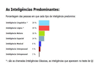 O documento discute cognição e inteligência, definindo-as e descrevendo teorias históricas como os testes de QI de Terman e Wechsler. Apresenta a teoria das inteligências múltiplas de Howard Gardner, identificando 7 tipos iniciais de inteligência e argumentando que indivíduos possuem habilidades em 1 ou 2 áreas. Conclui discutindo como as inteligências múltiplas podem ser aplicadas na educação.