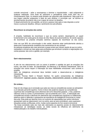 O documento discute a importância da inteligência emocional para o sucesso, definindo-a como a autoconsciência, empatia e gestão das emoções. A pedra basilar é reconhecer os próprios sentimentos para tomar boas decisões. Ser empático permite reconhecer os sentimentos dos outros. Gerir as emoções próprias e dos outros é fundamental para relacionamentos eficazes.