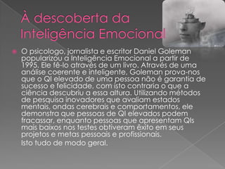 O documento resume a popularização da inteligência emocional pelo psicólogo Daniel Goleman em 1995 através de um livro, demonstrando que QI elevado não garante sucesso e que inteligência emocional é importante para controlar emoções e alcançar objetivos.