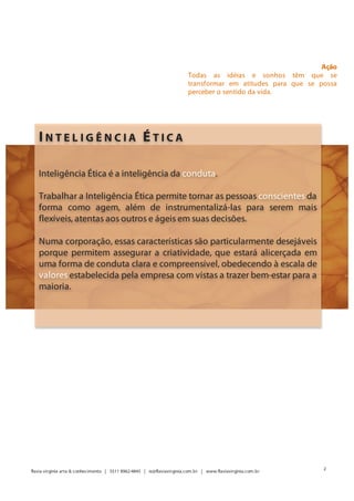 A inteligência ética é sobre desenvolver a consciência da própria conduta para tomar decisões flexíveis e atentas aos outros. Ela é útil para empresas garantir a criatividade baseada em valores compartilhados e o bem-estar coletivo. O documento descreve aplicações práticas, formatos e a especialista Flávia Virginia.