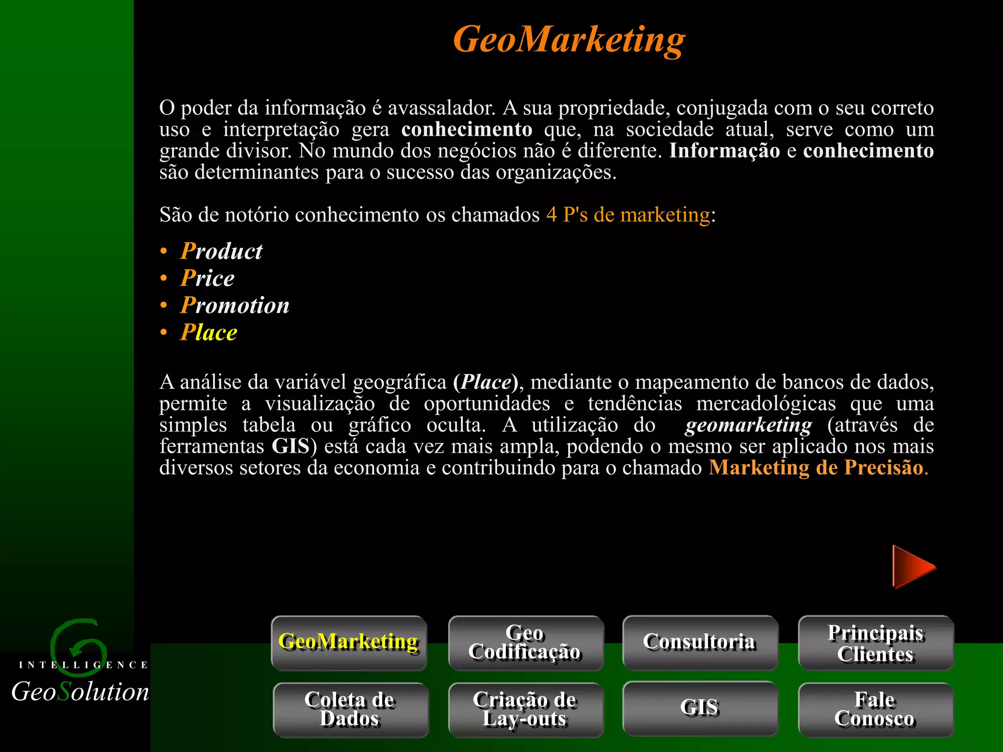 O documento descreve os serviços de geomarketing oferecidos pela empresa GeoSolution, incluindo coleta e análise de dados, geocodificação, criação de mapas e consultoria para tomada de decisões de negócios.