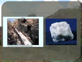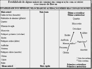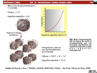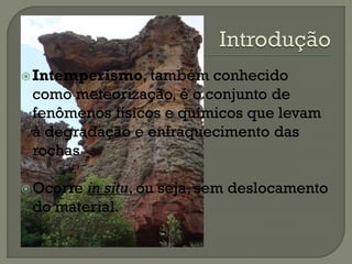 O documento descreve os processos de intemperismo e sua influência na formação dos solos. O intemperismo pode ocorrer por processos físicos, químicos e biológicos e é influenciado por variáveis climáticas, propriedades dos materiais e locais. O intemperismo transforma as rochas em materiais mais estáveis e dá origem aos solos.
