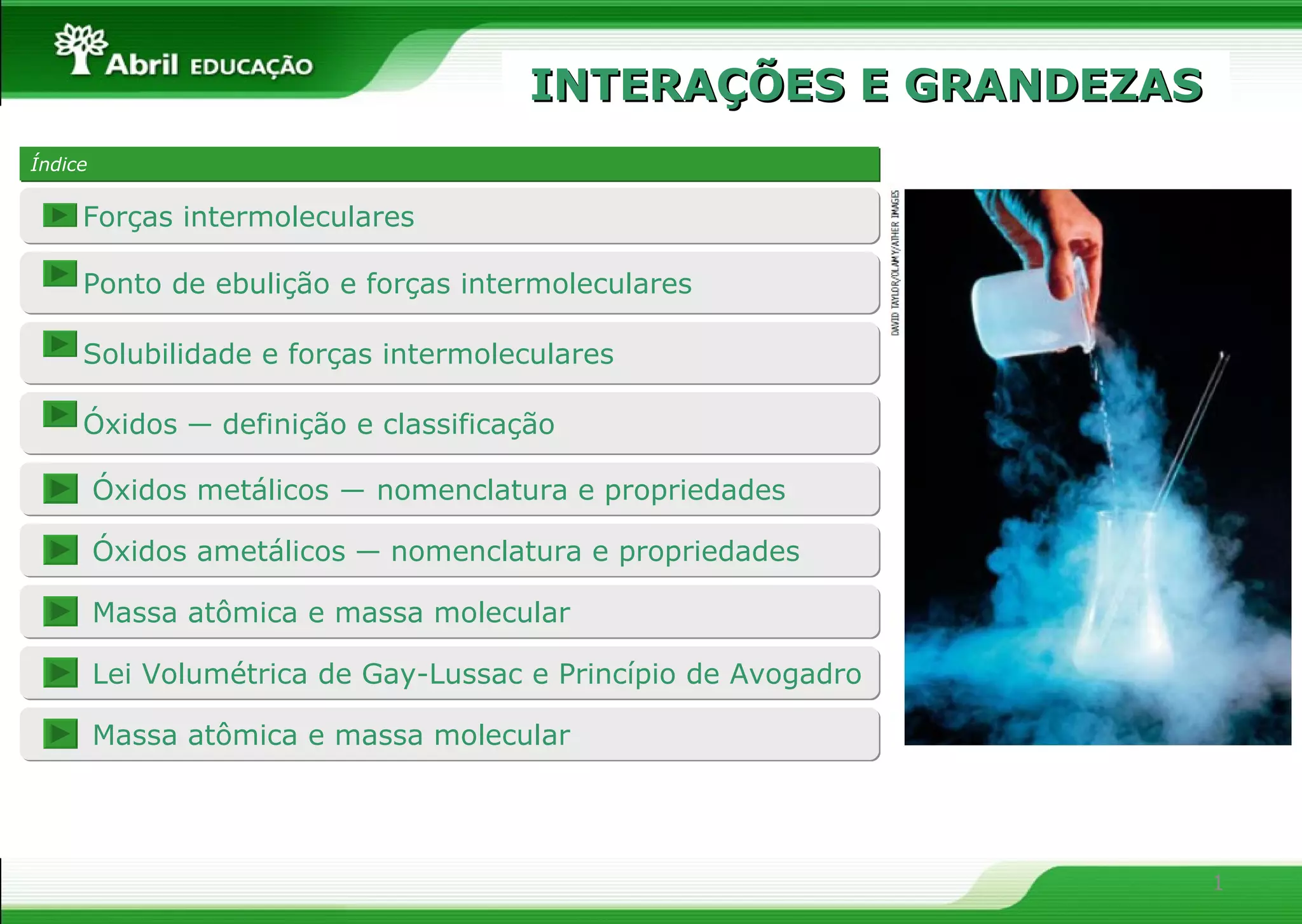 O documento discute conceitos químicos como forças intermoleculares, pontos de ebulição, solubilidade, óxidos, lei de Gay-Lussac, princípio de Avogadro, massa atômica e massa molecular. Explica como as forças intermoleculares determinam propriedades como pontos de ebulição e solubilidade e classifica óxidos em metálicos e ametálicos.