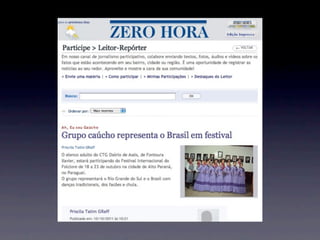 O documento discute a interatividade no jornalismo digital e como o leitor pode se sentir mais envolvido no processo jornalístico através de trocas com jornalistas e discussões em fóruns. Também diferencia interatividade reativa, com respostas previsíveis, de interatividade mútua, que permite negociação e fluxos dinâmicos.