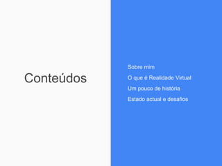 O documento resume a história e o estado atual da realidade virtual. Começa com uma breve introdução do que é realidade virtual e como foi representada na cultura popular. Em seguida, traça os principais marcos históricos, desde os anos 50 com o Cinerama até os sistemas de realidade virtual dos anos 60-70 de Sensorama e Ivan Sutherland. Por fim, descreve as principais tecnologias de realidade virtual atuais como CAVEs, headsets e controladores, e os desafios remanescentes.