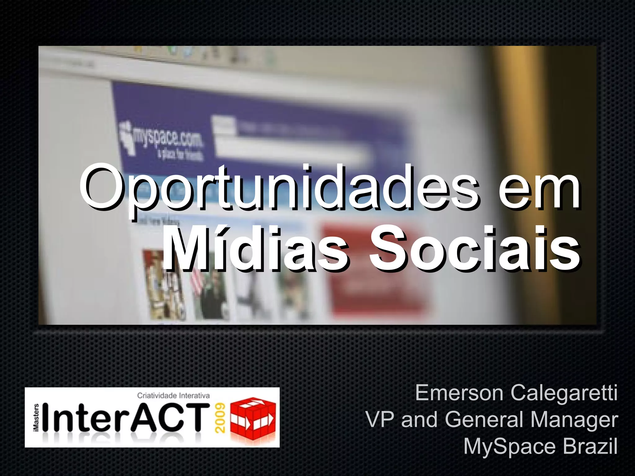 O documento discute o potencial das mídias sociais, destacando a popularidade do MySpace no Brasil e o perfil de seus usuários. Apresenta estratégias para engajar consumidores, enfatizando a importância dos influenciadores e a criação de experiências significativas. Além disso, menciona métricas para avaliar o retorno sobre o engajamento e a eficácia das campanhas de marketing.