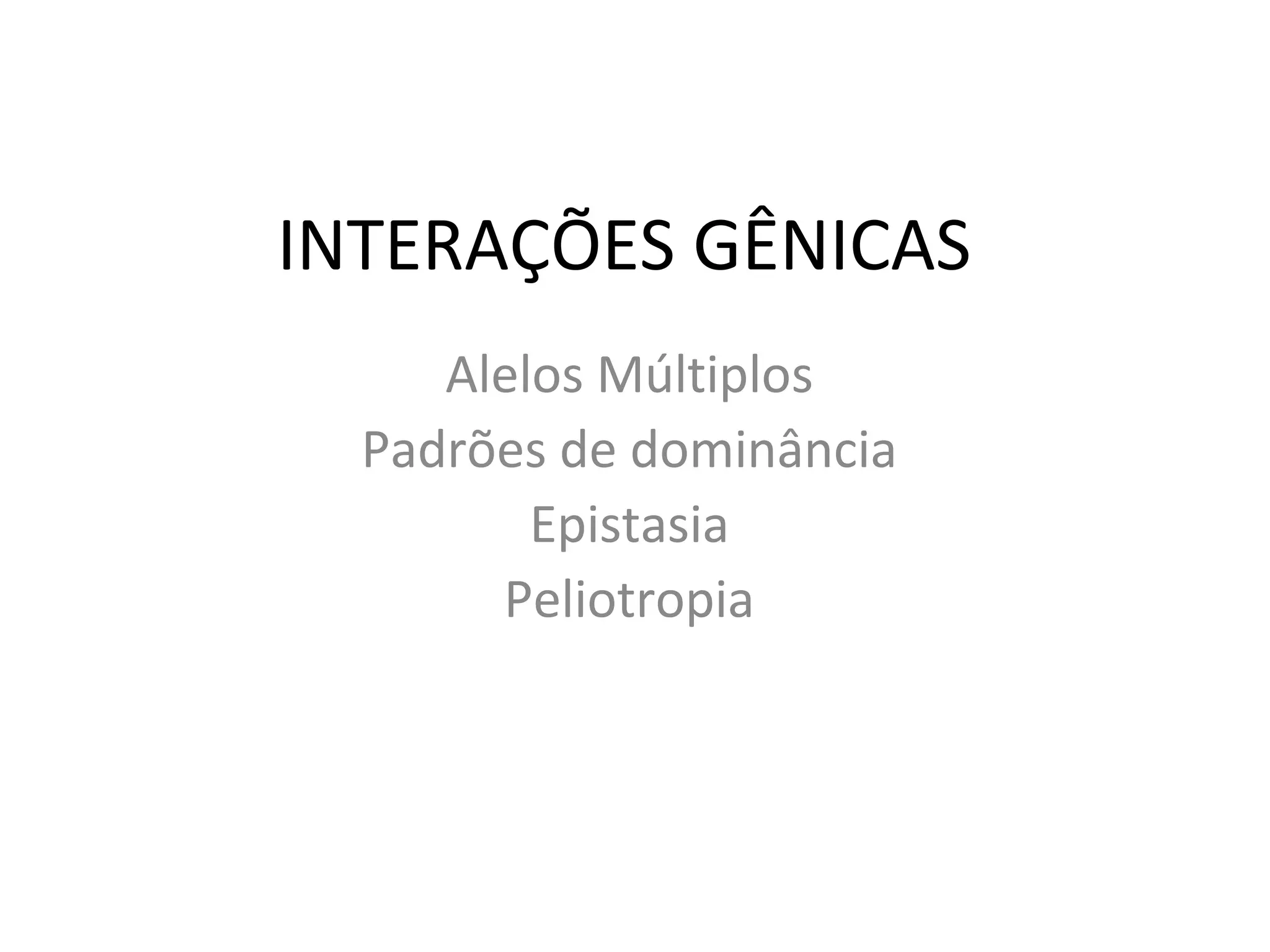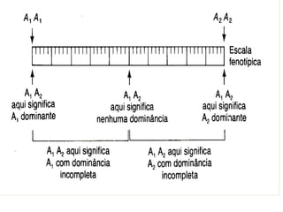 1) O documento discute diferentes padrões de dominância e interação gênica, incluindo dominância completa, incompleta e co-dominância.
