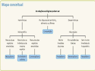 O documento descreve as diferentes relações ecológicas que podem existir entre os seres vivos em um ecossistema, incluindo mutualismo, competição, predação e parasitismo. É explicado que as populações de seres vivos em uma comunidade biológica interagem entre si e com o meio ambiente, trocando energia e matéria.