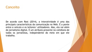 O documento discute os conceitos de interatividade segundo diferentes autores, definindo-a como a relação entre veículos de comunicação e público e distinguindo dois tipos: a interatividade seletiva, em que o público escolhe os conteúdos, e a interatividade comunicativa, que permite a comunicação e expressão do público.