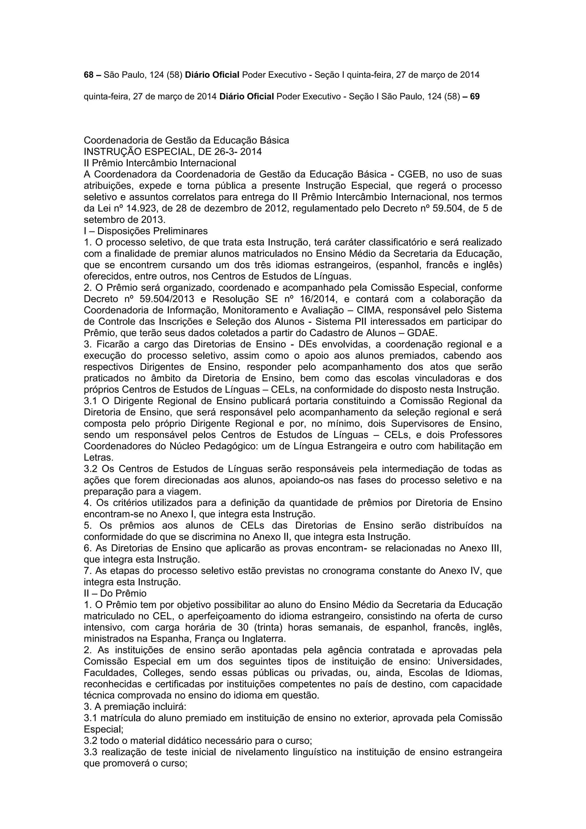 Este documento descreve as diretrizes para a seleção de estudantes do ensino médio para receberem prêmios de intercâmbio internacional para estudar espanhol, francês ou inglês na Espanha, França ou Inglaterra. O processo seletivo será realizado pelas Diretorias Regionais de Ensino e os critérios incluem notas escolares, frequência e não ter recebido o prêmio anteriormente. Os prêmios incluem cursos de idiomas, transporte, hospedagem e alimentação.