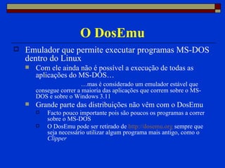 O DosEmu Emuladorque permite executar programas MS-DOS dentro do Linux Com ele ainda não é possível a execução de todas as aplicações do MS-DOS… … mas é considerado um emulador estável que consegue correr a maioria das aplicações que correm sobre o MS-DOS e sobre o Windows 3.11 Grande parte das distribuições não vêm com o DosEmu Facto pouco importante pois são poucos os programas a correr sobre o MS-DOS O DosEmu pode ser retirado de http://dosemu.org sempre que seja necessário utilizar algum programa mais antigo, como o Clipper