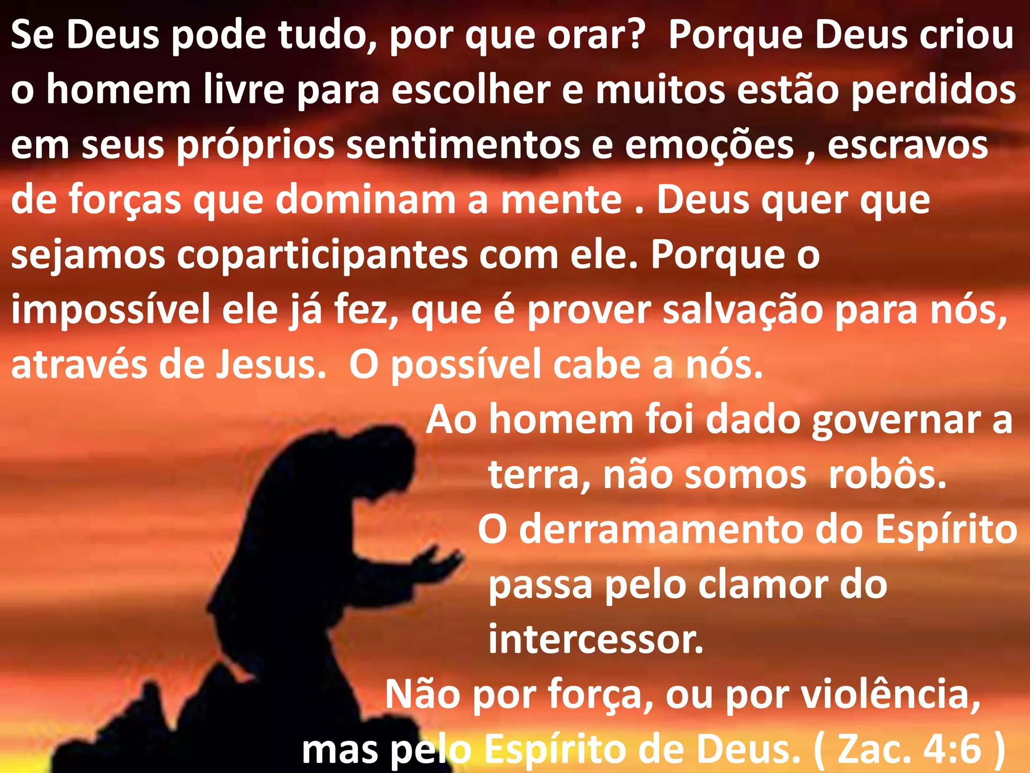 O texto discute por que devemos orar, apesar da onipotência de Deus. A oração é importante porque Deus deu ao homem livre-arbítrio e muitos estão perdidos em sentimentos e emoções escravizantes. Deus quer que sejamos coparticipantes com Ele através da oração, já que Ele já providenciou a salvação por meio de Jesus, cabendo ao homem governar a terra e clamar por meio da oração intercessora, não pela força, mas pelo Espírito de Deus.
