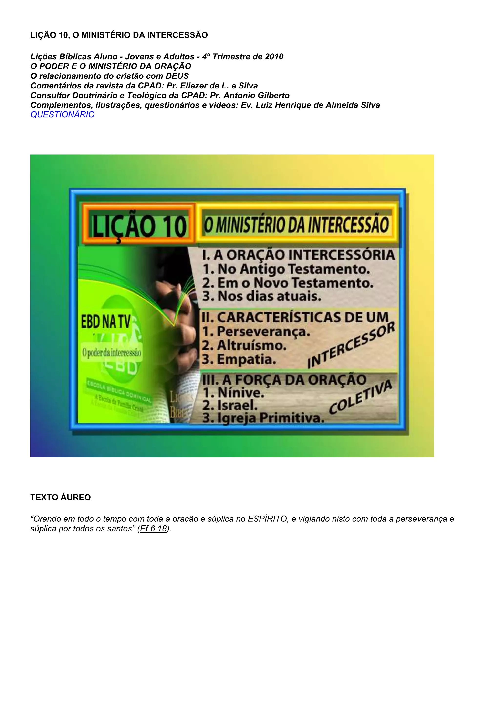 (1) O documento discute o ministério da intercessão e como Abraão intercedeu por Sodoma e Gomorra para que DEUS não destruísse as cidades se encontrasse 50, 45 ou 40 justos nelas. (2) Também fala sobre como Cristo intercede pelos crentes no céu para que sejam salvos perfeitamente. (3) Adverte que aqueles cujo coração está preso aos prazeres deste mundo corrupto, como a esposa de Ló, não escaparão da ira de DEUS.