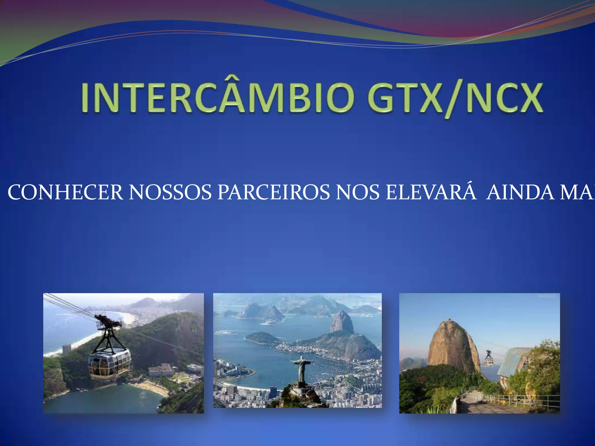 O documento descreve um intercâmbio entre a empresa GTX e sua parceira NCX no Rio de Janeiro. Serão selecionados o melhor gerente e vendedor de cada um dos grupos Standart, Master e Prêmio para conhecer as lojas e sede da NCX em outubro. Um segundo intercâmbio em novembro levará os melhores líderes e um vendedor sorteado.