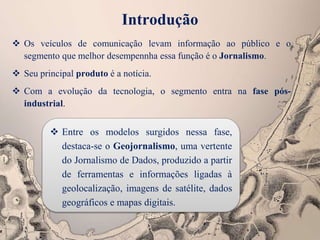 O geojornalismo é uma nova vertente do jornalismo que se utiliza de tecnologias modernas como geolocalização e dados cartográficos para criar narrativas informativas. Este modelo surge no contexto do jornalismo pós-industrial, onde as tradições de produção e distribuição de notícias estão sendo transformadas por novas práticas digitais. Ao facilitar o mapeamento e a organização de conteúdo, o geojornalismo oferece novas oportunidades e desafios para jornalistas, enquanto adapta-se às demandas de um público mais participativo e exigente.