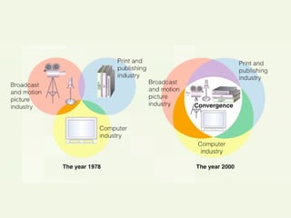 O documento discute como as novas tecnologias digitais democratizaram a produção e distribuição de conteúdo. Qualquer pessoa agora pode publicar conteúdo online, seja música, vídeos, fotos ou livros. A internet também subverteu o poder tradicional de comunicação, tornando difícil para as empresas de mídia alcançarem audiências fragmentadas.
