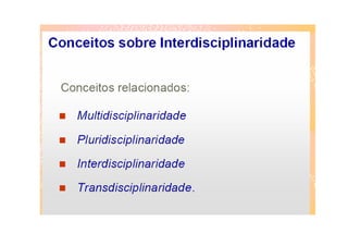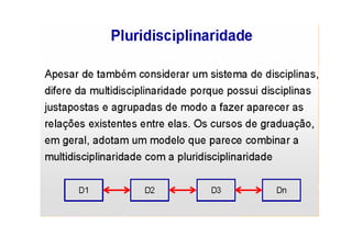 O documento discute a interdisciplinaridade nas práticas pedagógicas, definindo-a como a possibilidade de relacionar disciplinas em atividades que evitem a diluição ou justaposição delas. Apresenta metodologias interdisciplinares como projetos, eixos temáticos e temas geradores, e defende que o currículo deve ser contextualizado com base nas necessidades dos alunos.