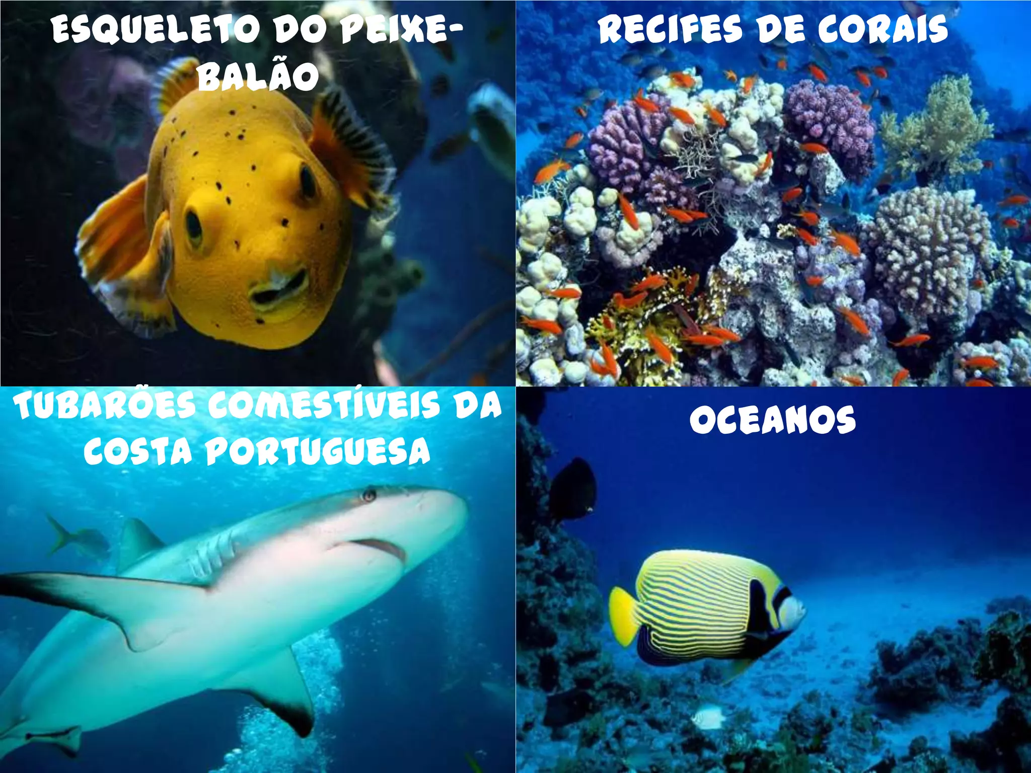 Este documento discute três tópicos: 1) a estrutura do esqueleto de peixes-balão, 2) os recifes de corais e 3) as espécies de tubarões encontradas na costa portuguesa. Referências bibliográficas são fornecidas no final.