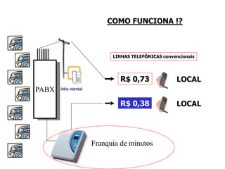 O documento apresenta uma solução para empresas utilizarem planos corporativos de telefonia celular conectados à central telefônica da empresa (PABX), permitindo chamadas para celulares a preços mais baixos a partir dos ramais. A solução oferece economia de até 48% nos custos com ligações locais e a liberdade de usar as linhas fixas apenas para chamadas fixas.