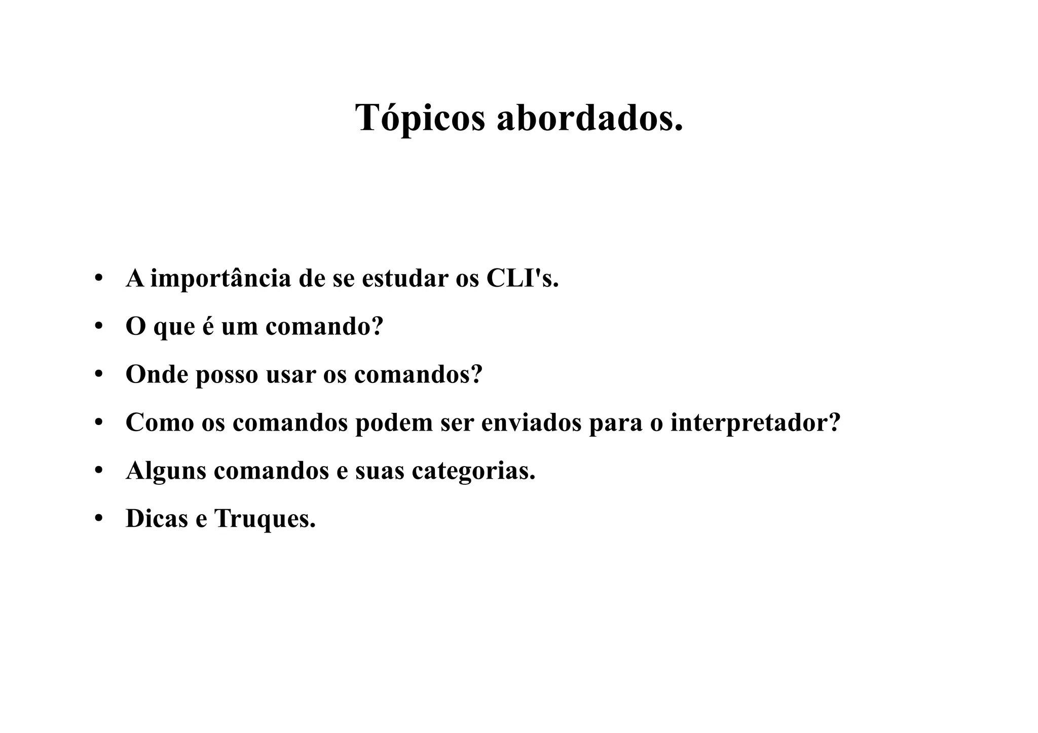 Este documento fornece uma introdução aos comandos de linha de comando no Linux, explicando a importância de aprender CLI, definindo o que é um comando e dando exemplos de comandos comuns como cd, ls e ifconfig junto com dicas para seu uso.