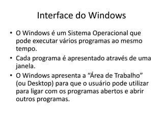 O documento descreve a interface do Windows, incluindo a área de trabalho, menu iniciar, barra de ícones, relógio, barra de inicialização rápida, barra de tarefas, janelas e atalhos. Ele também explica como configurar a área de trabalho, proteção de tela, opções de energia e resolução de vídeo.
