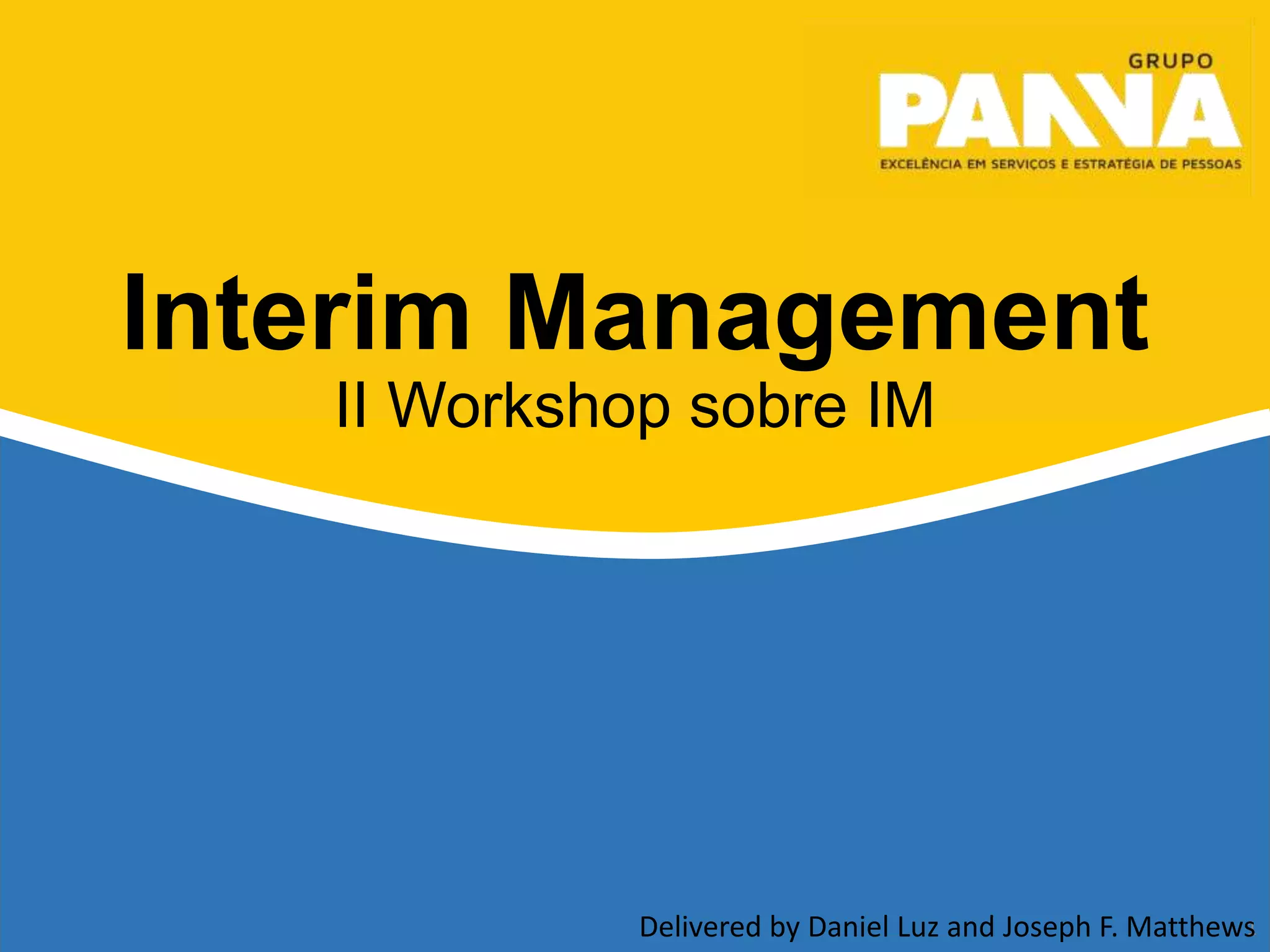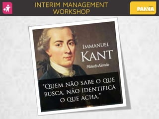O documento apresenta a agenda de um workshop sobre Interim Management. A agenda inclui apresentações sobre as "Três Caixas da Vida", uma visão geral sobre Interim Management, uma reflexão sobre legado e um painel de discussão. Haverá também um momento para inscrições no grupo de Interim Management.