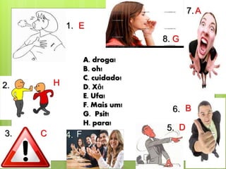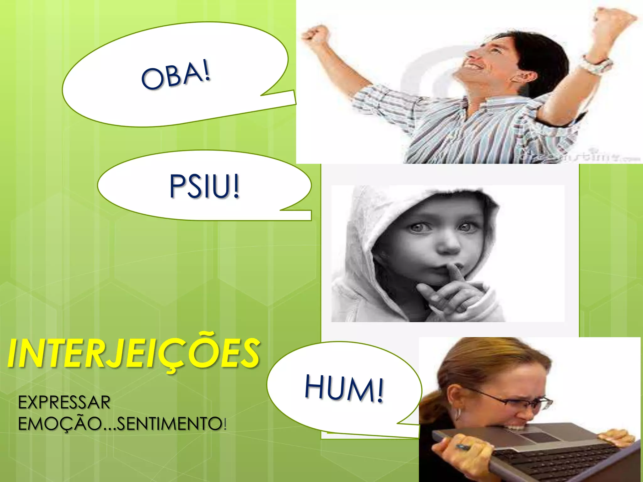 O documento lista várias interjeições em português e suas definições, agrupadas em duas categorias: interjeições simples e locuções interjetivas. A lista inclui interjeições comuns como "oh!", "cuidado!", "ufa!" e locuções como "quem me dera!", "me poupe!".