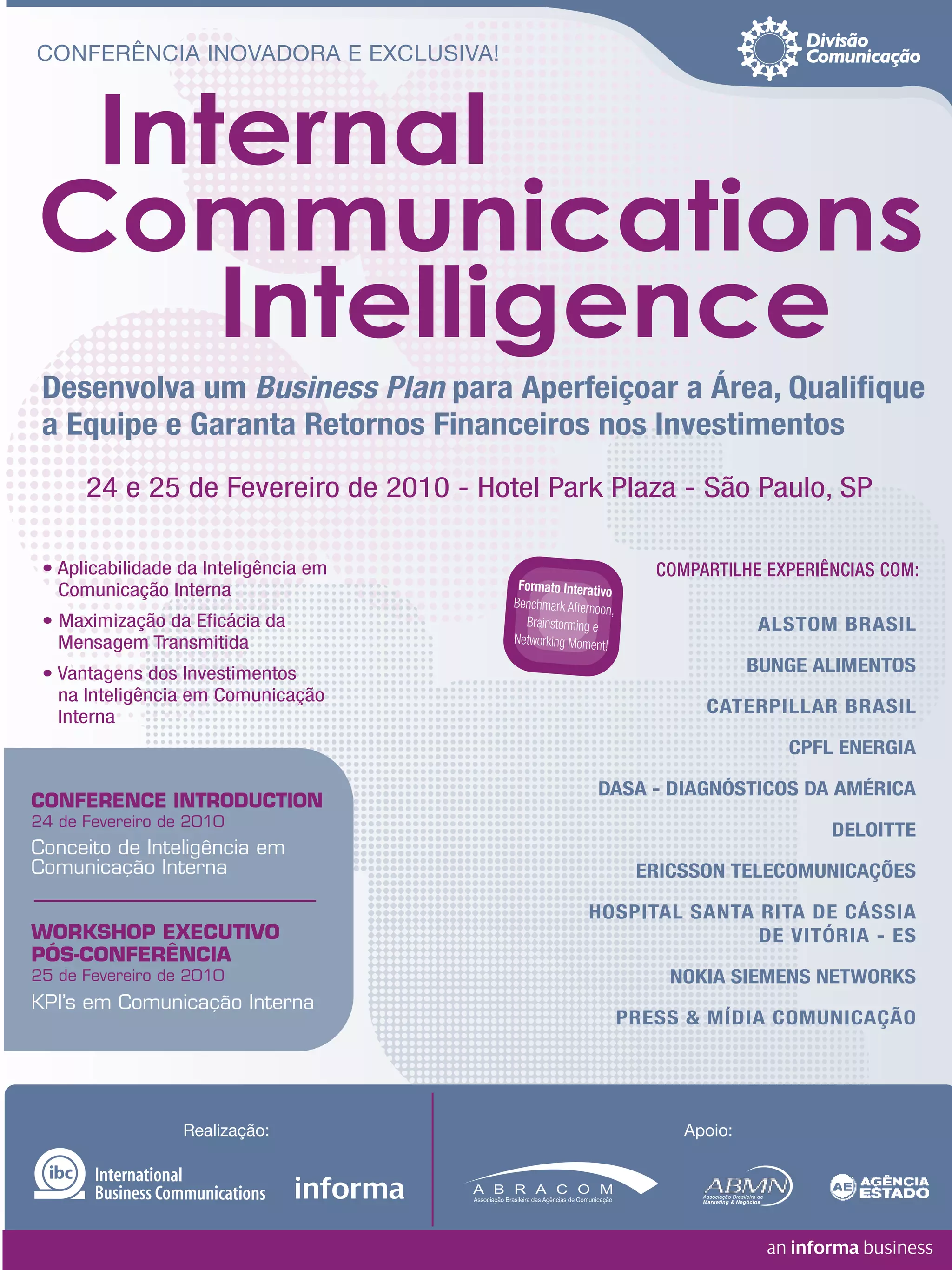 [1] Este documento anuncia uma conferência sobre inteligência em comunicação interna que ocorrerá nos dias 24 e 25 de fevereiro de 2010 em São Paulo. [2] A conferência abordará tópicos como aplicabilidade da inteligência em comunicação interna, maximização da eficácia da mensagem transmitida e vantagens dos investimentos na inteligência da área. [3] O evento contará também com um workshop executivo sobre indicadores de desempenho em comunicação interna no segundo dia.
