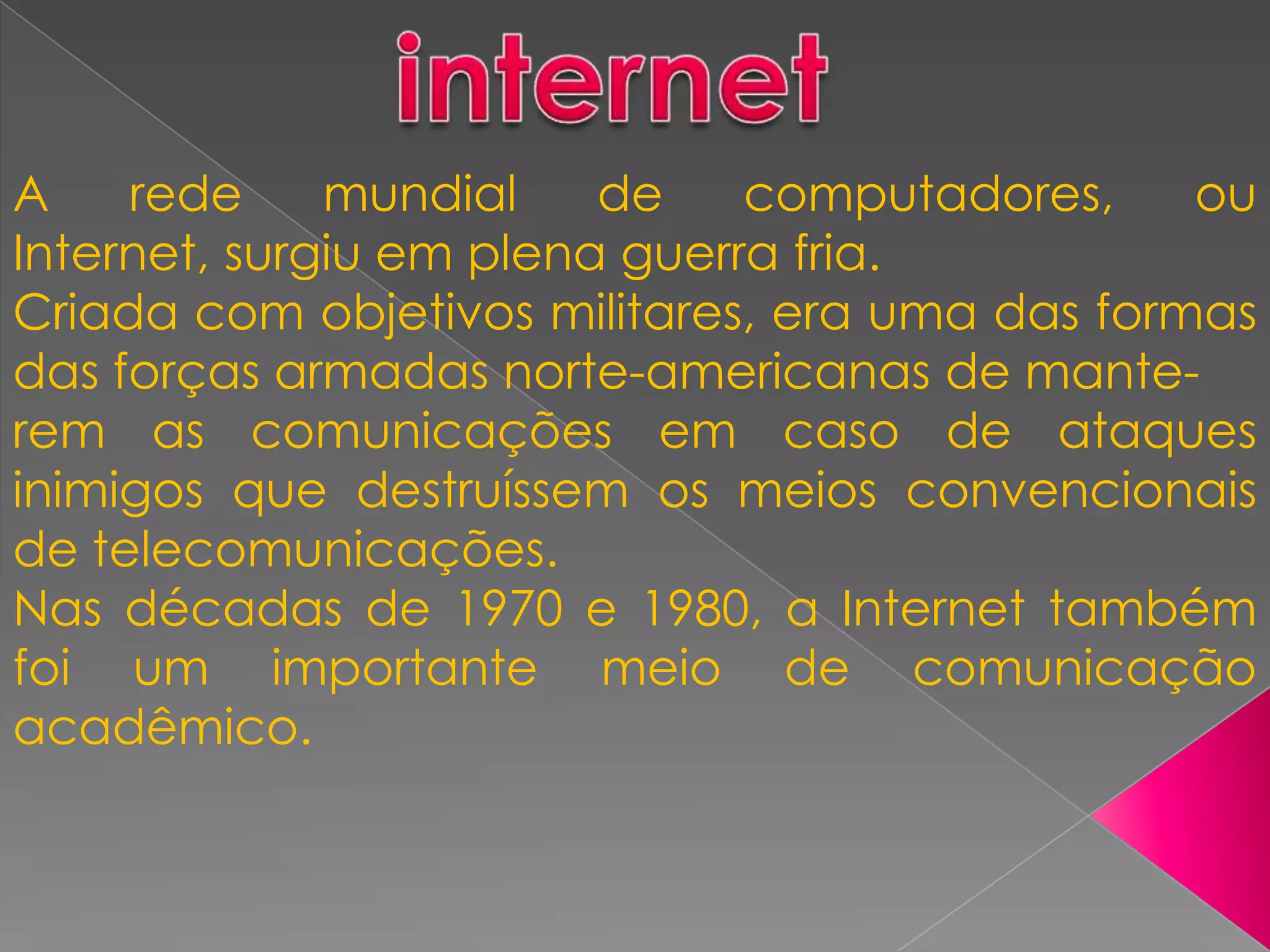 A Internet surgiu nos Estados Unidos durante a Guerra Fria com objetivos militares de comunicação, depois se expandiu para uso acadêmico e apenas na década de 1990 alcançou o público em geral, crescendo rapidamente e se tornando onipresente e essencial na vida moderna.