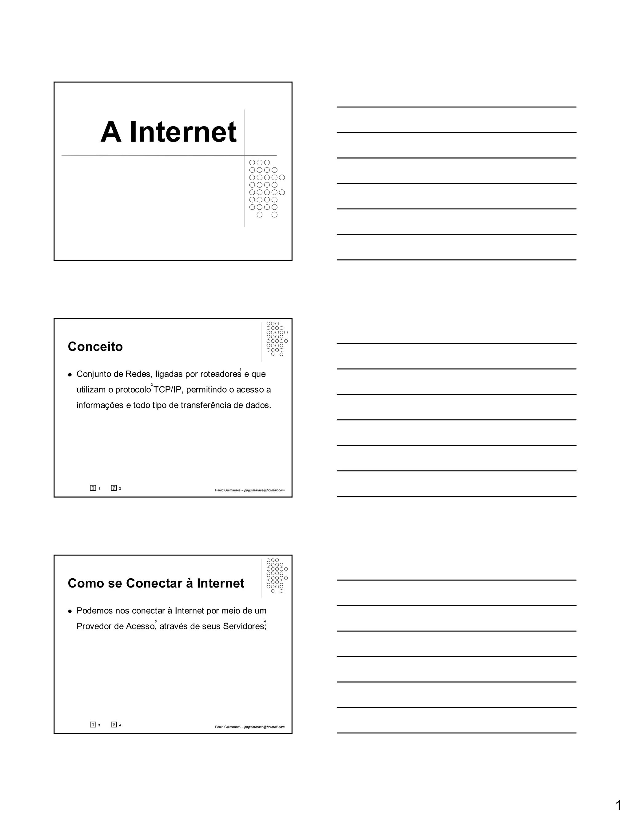 O documento descreve os conceitos fundamentais da Internet, incluindo como se conectar à rede, endereçamento na Internet, domínios, serviços como e-mail e FTP, e dispositivos como roteadores e modems.