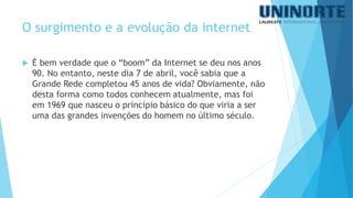 O documento descreve a história e evolução da internet desde sua criação na década de 1960 até os dias atuais. Começou como uma rede militar chamada ARPANET nos EUA durante a Guerra Fria e evoluiu para incluir o protocolo TCP/IP e o surgimento da World Wide Web na década de 1990, levando ao boom do uso comercial e popular da internet.