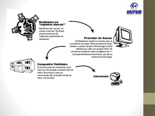 O documento descreve o que é a Internet, sua estrutura física descentralizada baseada em backbones de alta velocidade, as formas de conexão por cabos e sem fio, o que são intranets e extranets, dicas de segurança, ameaças como vírus, e conceitos como protocolos TCP/IP, HTTP, URLs. A conclusão ressalta os benefícios da Internet quando usada corretamente.