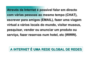 1. A Internet é uma rede global de redes interligadas que permite a comunicação e troca de informações entre milhões de computadores em todo o mundo. Surgiu como uma rede militar dos EUA nos anos 1960 e evoluiu para incluir várias redes.
