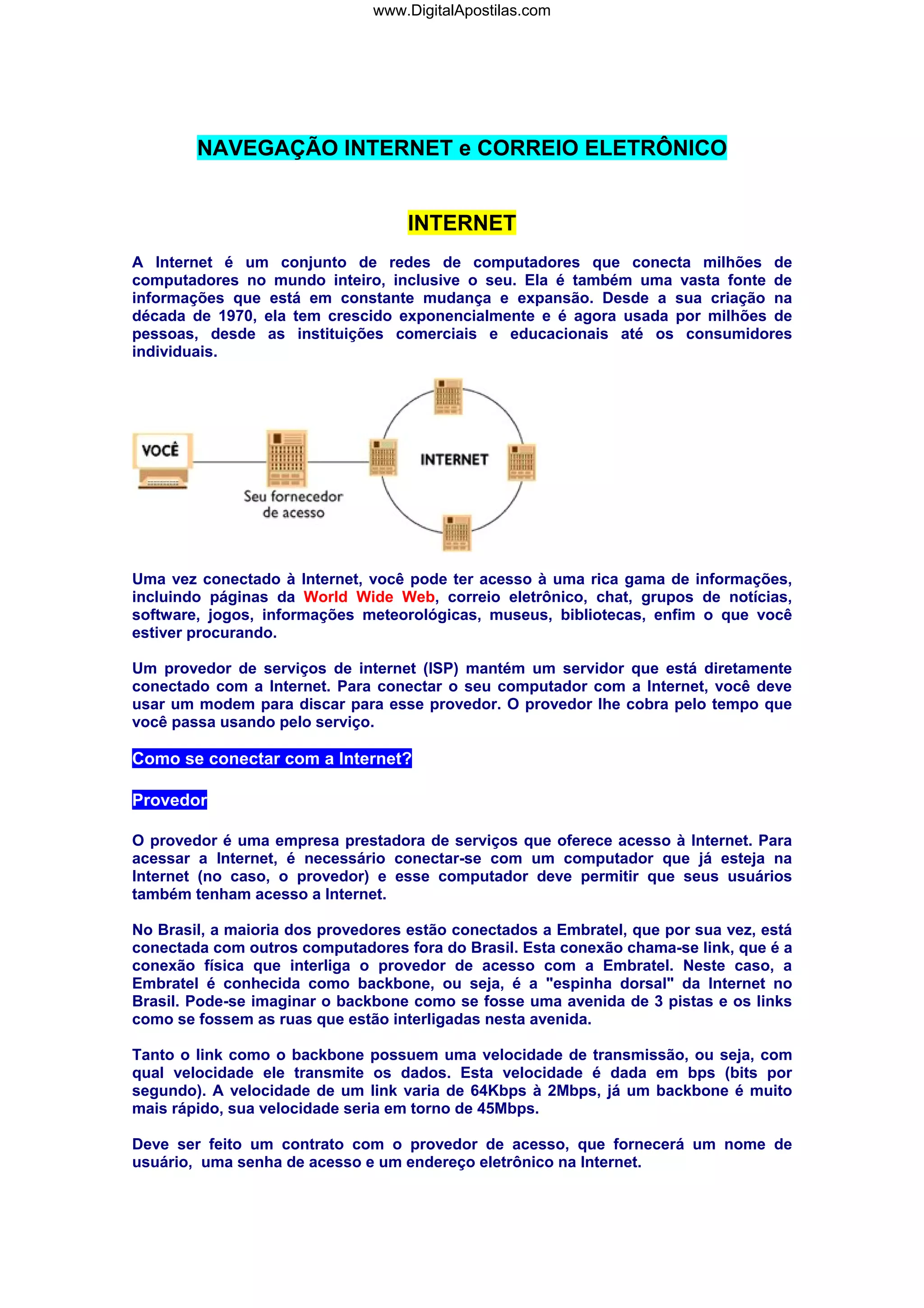 O documento fornece informações sobre a Internet e correio eletrônico. Explica o que é a Internet, como se conectar à Internet através de um provedor, os tipos de software necessários e como navegar na Internet com segurança e privacidade. Também discute URLs, navegadores da Web e como gerenciar favoritos, histórico e cookies.