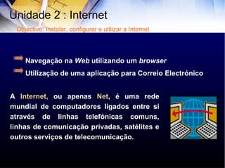 O documento aborda a utilização da internet e a configuração de protocolos como TCP/IP e modelos de rede, destacando suas camadas e funções. Além disso, explora os serviços oferecidos pela internet, como correio eletrônico, FTP, e videoconferência. Também menciona a história da internet, desde seu surgimento na década de 1960 até sua evolução e serviços disponíveis atualmente.