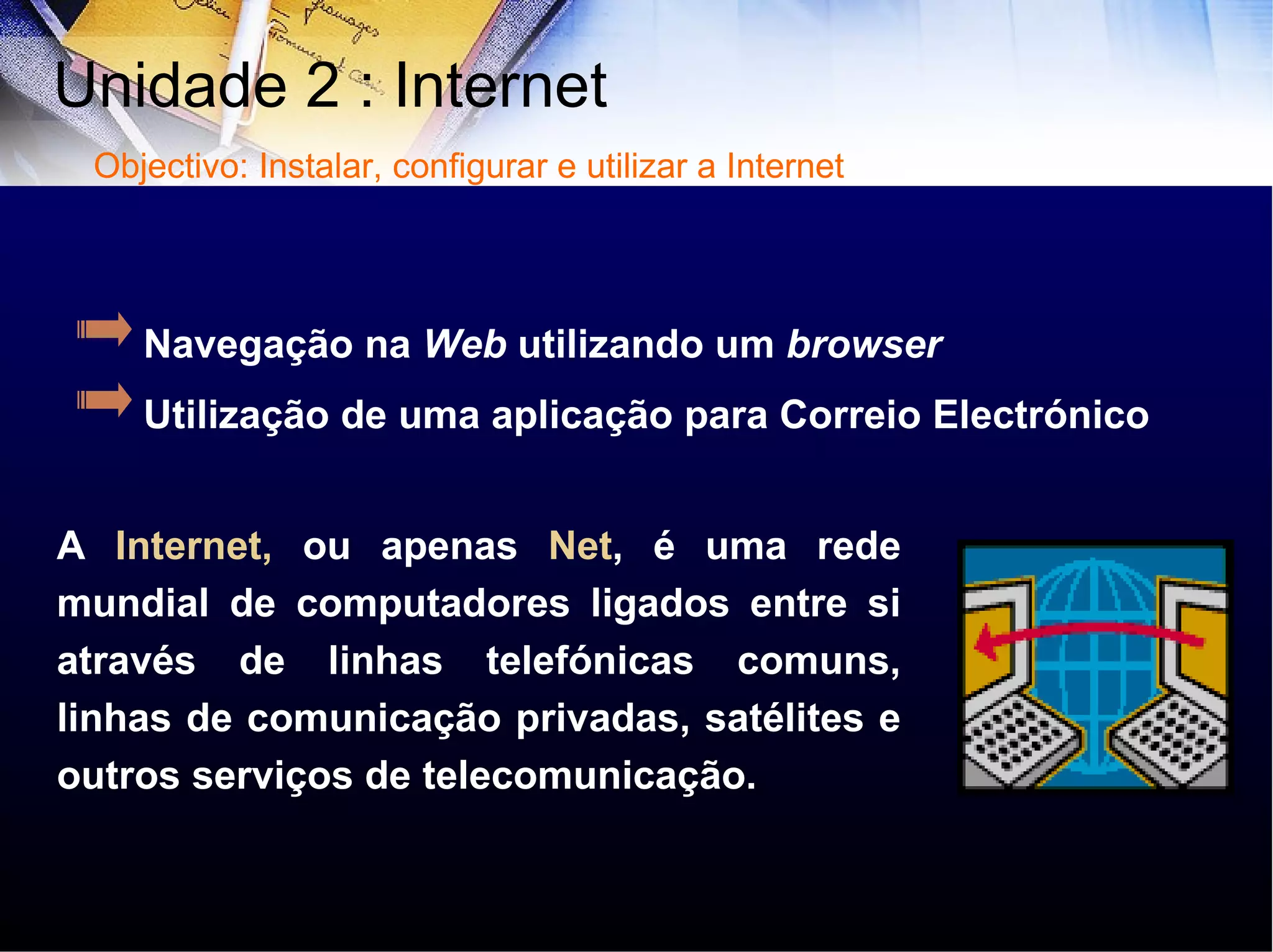 O documento aborda a utilização da internet e a configuração de protocolos como TCP/IP e modelos de rede, destacando suas camadas e funções. Além disso, explora os serviços oferecidos pela internet, como correio eletrônico, FTP, e videoconferência. Também menciona a história da internet, desde seu surgimento na década de 1960 até sua evolução e serviços disponíveis atualmente.